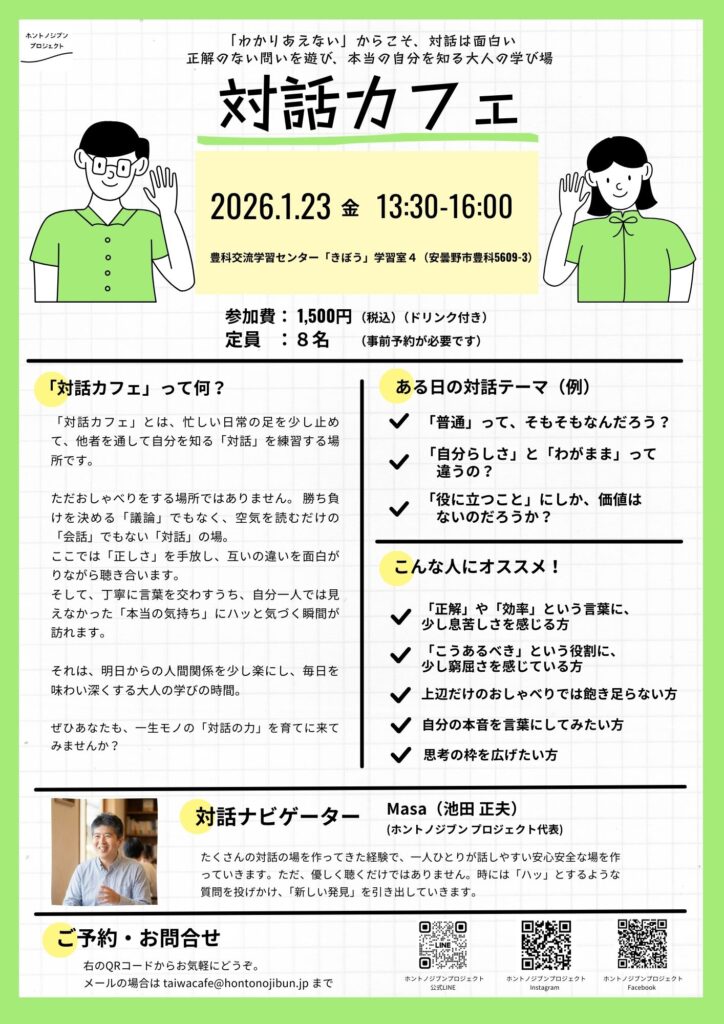 【対話カフェ】2026/1/23(金)豊科交流学習センター「きぼう」(長野県安曇野市)にて開催します【終了しました】