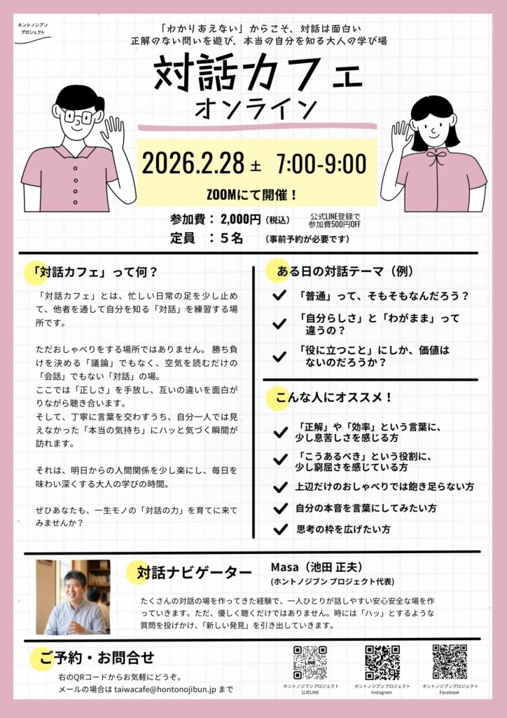 【オンライン対話カフェ】2026/2/28(土)ZOOMにて開催します【終了しました】 2026 3/01 お申し込みはこちら お申込み・お問合せは、taiwacafe@hontonojibun.jpまでお願いします。チラシのQRコードから、各SNSでも受け付けています。 イベント ニュース
