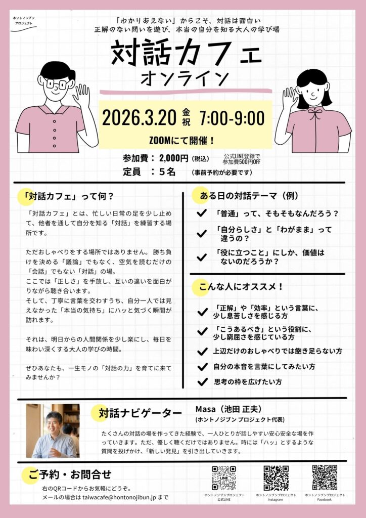 【オンライン対話カフェ】2026/3/20(金・祝)ZOOMにて開催します 2026 3/01 お申し込みはこちら お申込み・お問合せは、taiwacafe@hontonojibun.jpまでお願いします。チラシのQRコードから、各SNSでも受け付けています。 イベント ニュース 新着情報