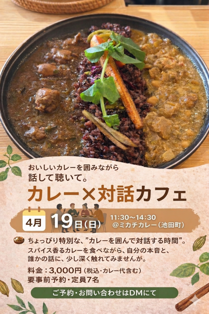 【カレー×対話カフェ】2026/4/19(日)ミカチカレー(長野県池田町)にて開催します 2026 3/31 お申し込みはこちら お申込み・お問合せは、taiwacafe@hontonojibun.jpまでお願いします。チラシのQRコードから、各SNSでも受け付けています。 イベント ニュース 新着情報